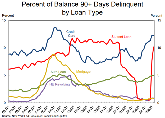 While it is expected that “sub-prime” borrowers (those with lower credit scores/income) would be the area seeing rising delinquencies, it has actually recently been shown across all borrowers, even those labeled “prime” or “near-prime” as the chart below shows. The prime and near-prime groups have actually seen a bigger increase in delinquencies over the last year.
