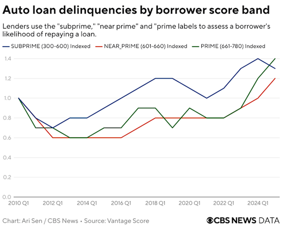 As people struggle with monthly expenses and fall behind on monthly payments, this affects the companies that loaned the money as they can’t get paid back. Over the past month we’ve seen some bankruptcy filings from those associated with auto lending and more specifically sub-prime auto lending. Last month, a company called Tricolor filed for chapter 7 bankruptcy. Tricolor was in the business of subprime lending, offering terms to those with low income and bad credit scores. It was disclosed earlier in the year that actually 68% of its borrowers had no credit score at all. There are reports of some fraudulent activity in the company as they’re now being investigated. This did cause losses for some well-known banks including JPMorgan, Barclays, and Fifth Third Bancorp. JPMorgan reported a charge-off of $170 million from the Tricolor bankruptcy and their CEO Jamie Dimon warned this event may be a sign of a broader issue in the auto credit market. There have been a few other recent bankruptcy filings related to the auto industry and auto lending that have continued to raise concerns.