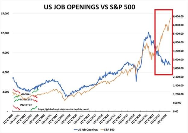 Despite the fact that many things appear to be cracking, the stock market has continued its rise and should end the month of October positive. It is also entering a period of historical positive returns here at the end of the year. While the market is stretched and well above some of its long-term moving averages, it doesn’t mean it can’t continue. With that though, a chart that caught my eye recently is the S&P 500 along with total reported nonfarm job openings. Historically the number of job openings has trended higher over time along with the stock market. When job openings have declined over a period of time it has coincided with a recession. Which then of course coincides with the stock market coming down. So, the two have been positively correlated historically. Since 2022 that has not been the case and is shown in the chart below.