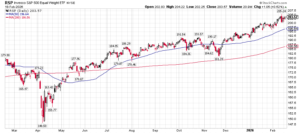 Another way to look at this divergence between the big tech stocks and the rest of the market is through another ETF, an equal-weight S&P 500 fund. This uses the same stocks within the S&P 500 but has them each weighted equally. Whereas the S&P 500 index is weighted by the market cap of each stock. And as stated, the magnificent 7 stocks have over a 30% share of the weight. You can see below how this equal weight ETF has had a nice uptrend since November, and is off to a great start in 2026.